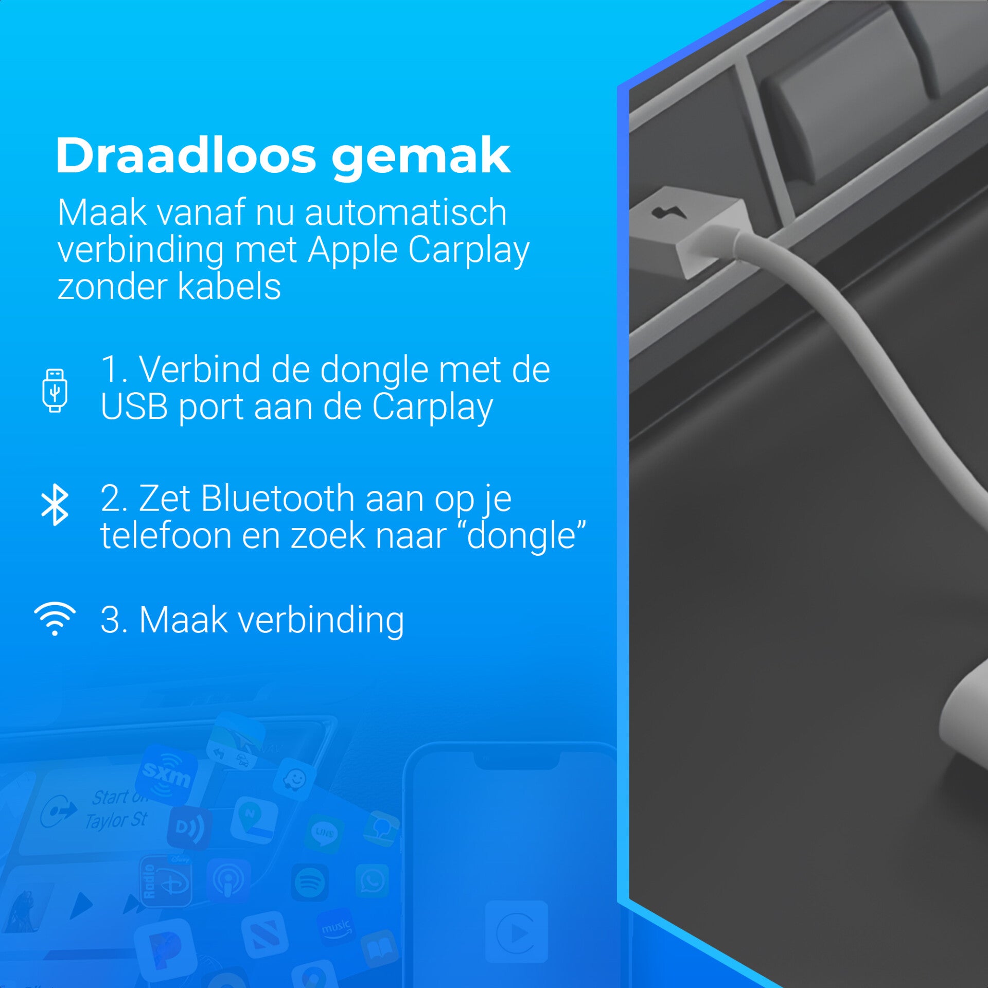 Installeer de STEN CarPlay Dongle in uw USB A of USB C poort van uw autoradio en dan zal de installatie eenmalig nodig zijn. Daarna verbind deze automatisch. De eenmalige installatie is enkel eenkeer via Bluetooth connectie te maken met de STEN CarPlay Dongle. Easy as that!
